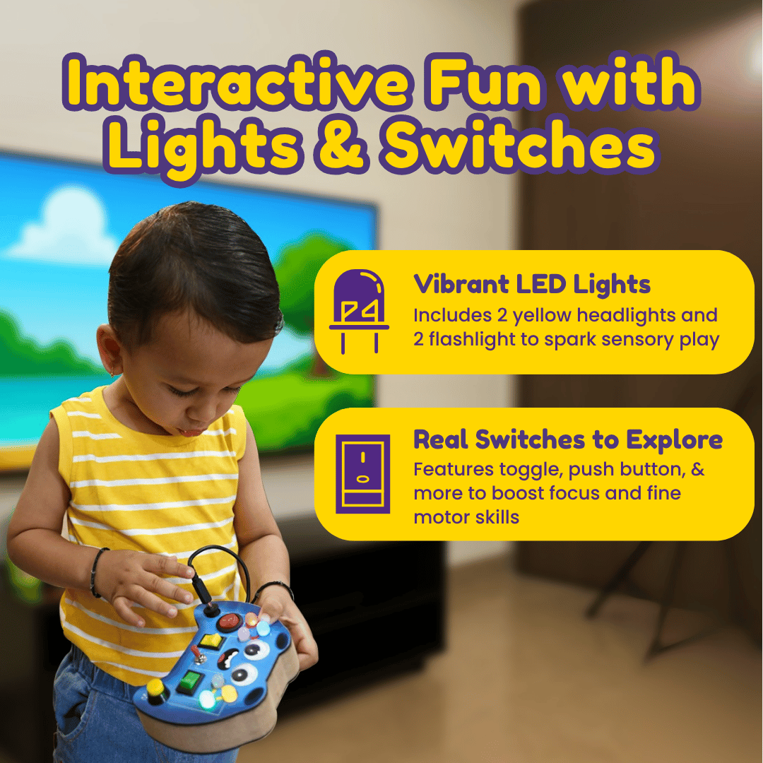 Give your child screen-free play that actually builds real-life skills. The Mini-Minds Controller is a Montessori-inspired busy board with real lights, buttons, plug-and-play socket, toggle switches, music, and 3D googly eyes — designed to spark curiosity and make kids think “How does this work?”