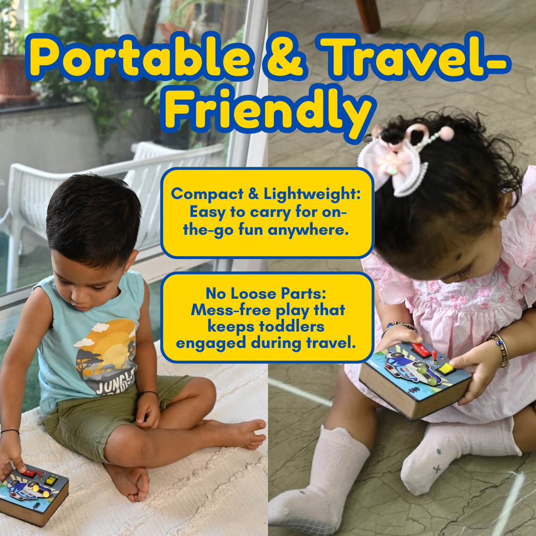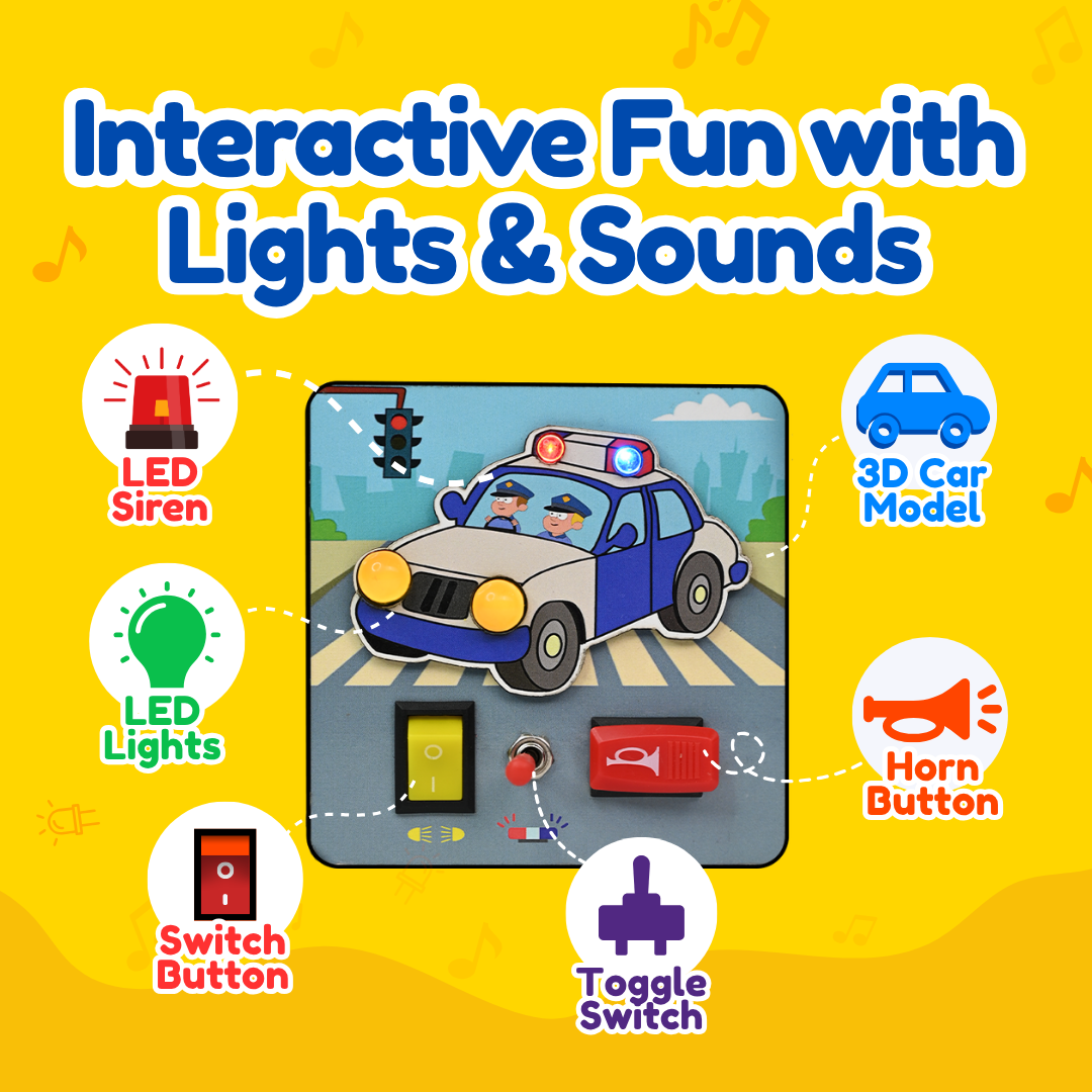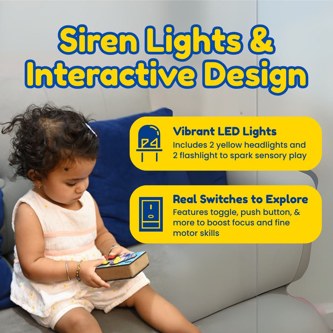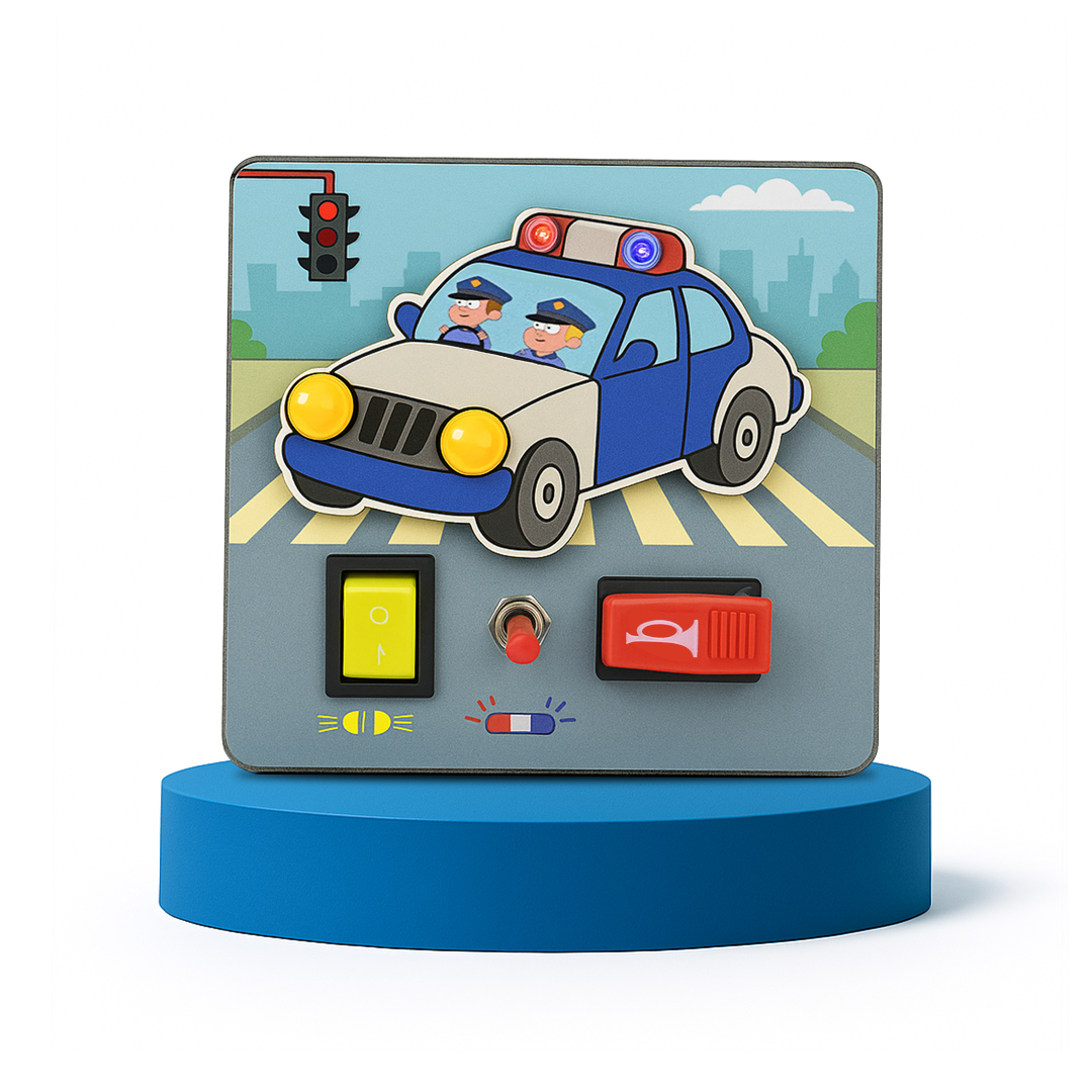 The Tiny Trails Police Cruiser is a hands-on, Montessori-inspired busy board packed with real lights, buttons, toggle switches, and even a real siren sound—perfect for little explorers to discover how things work! Designed for tiny hands, it boosts brain development, creativity, fine motor skills, problem-solving, and hand-eye coordination through joyful, screen-free play, helping reduce screen time. Durable, compact, and travel-friendly, it keeps kids happily engaged anywhere.