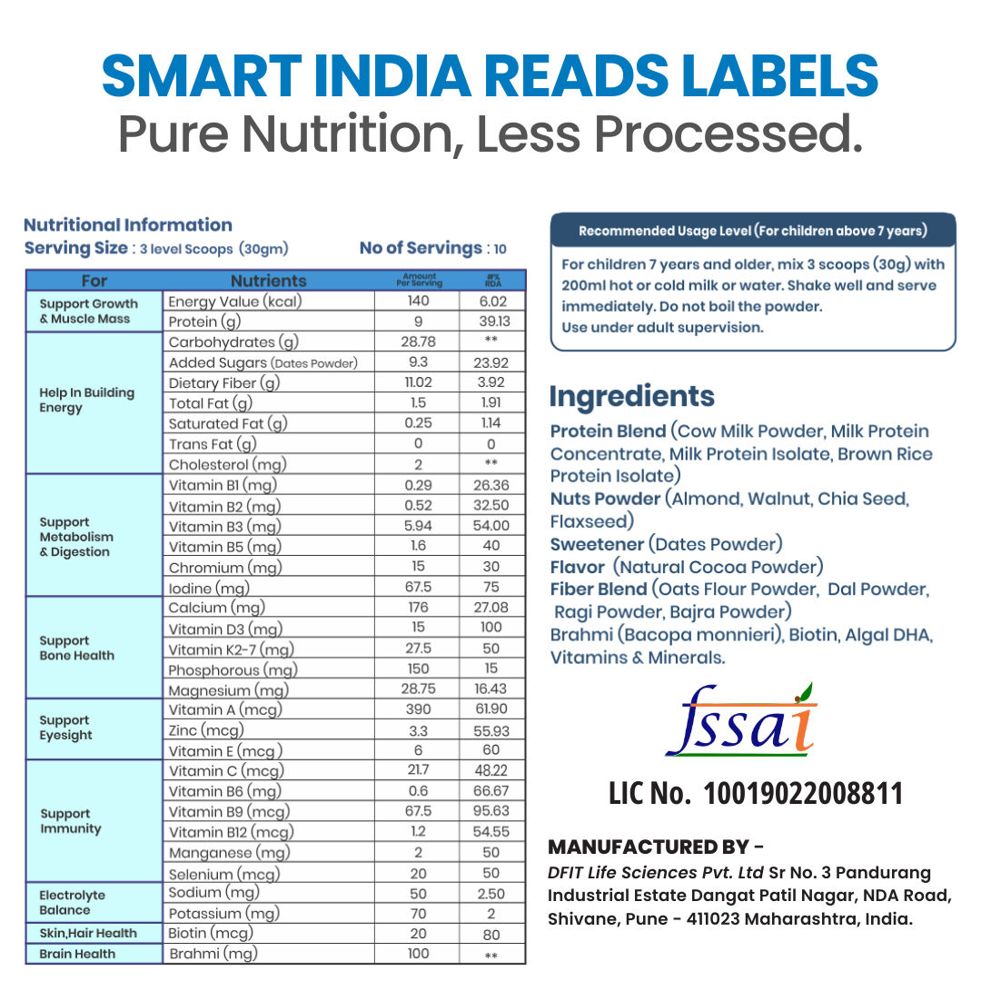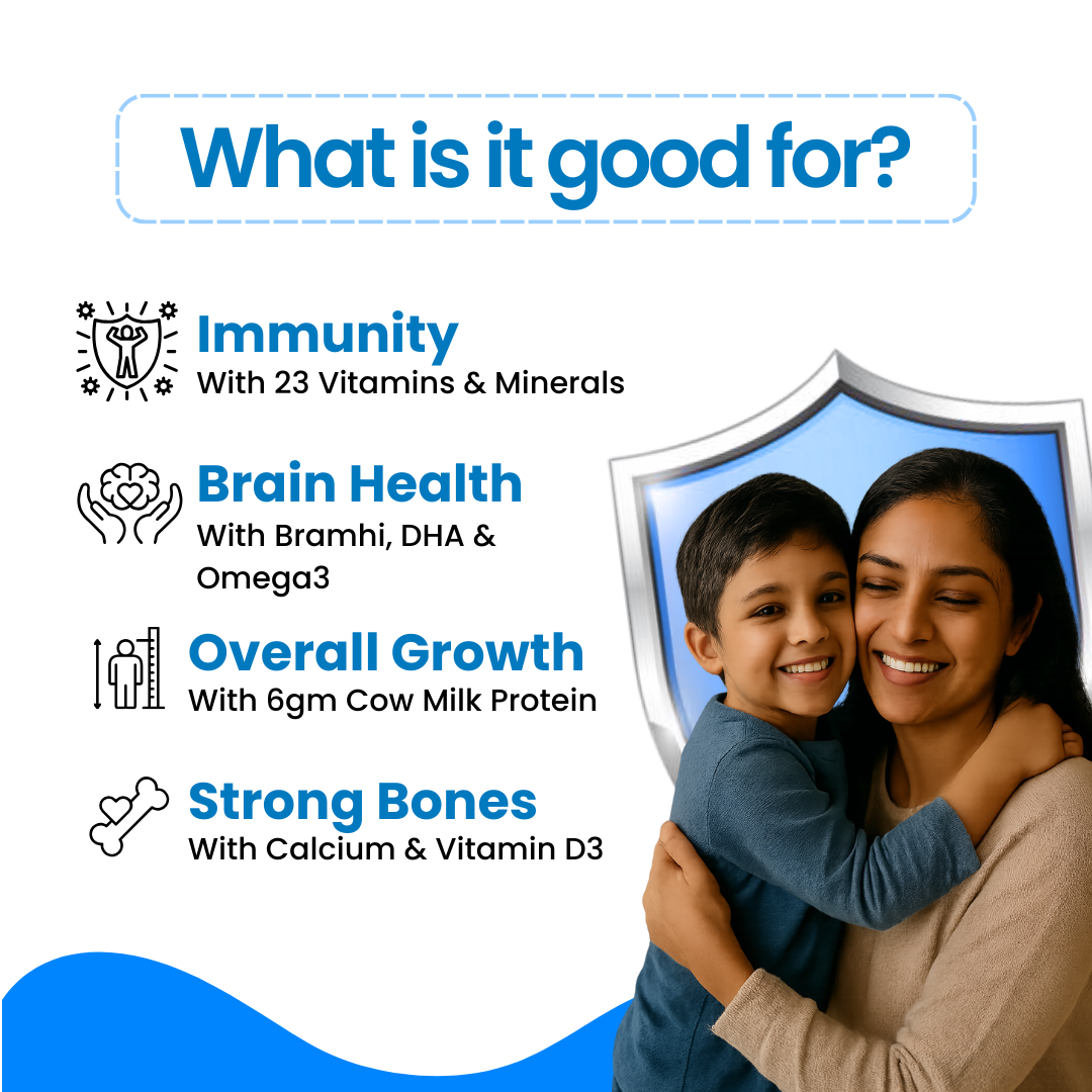 The drink contains DHA (Docosahexaenoic Acid) and Brahmi powder, both known to support memory, concentration, and overall cognitive function, making it perfect for growing minds.